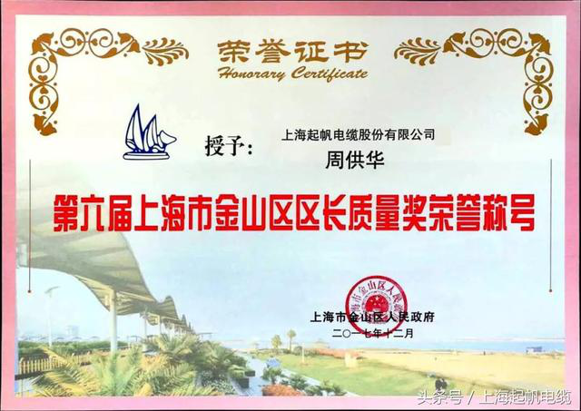 上海起帆電纜股份有限公司總經(jīng)理周供華作為獲獎嘉賓出席頒獎典禮,區(qū)長胡衛(wèi)國為其頒發(fā)區(qū)長質(zhì)量獎。