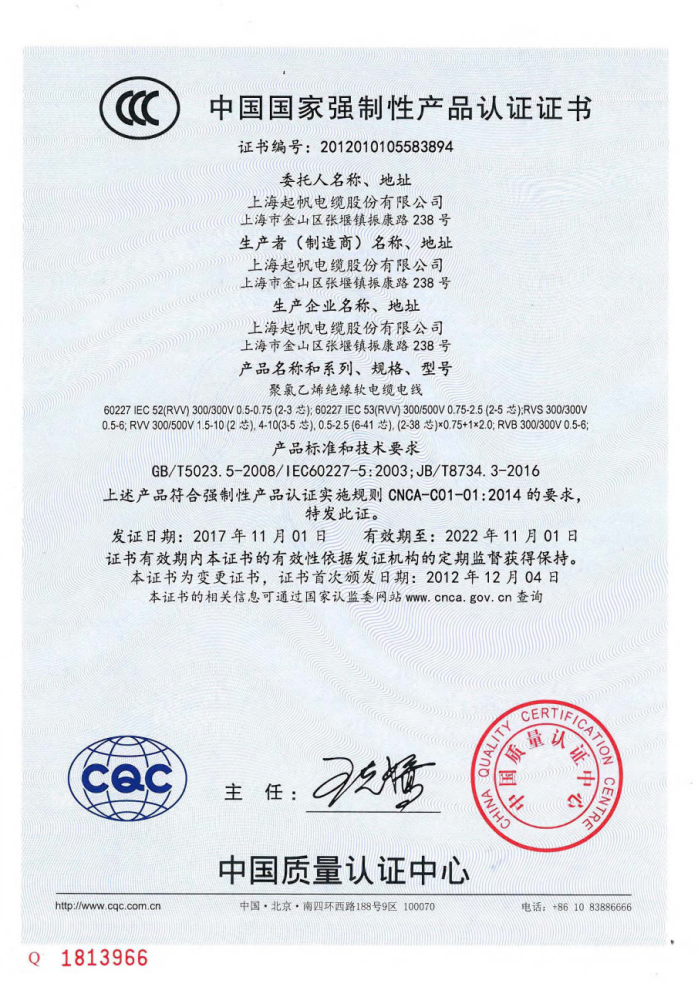 中國國家強制性產(chǎn)品認(rèn)證證書RVV聚氯乙烯絕緣軟電纜電線