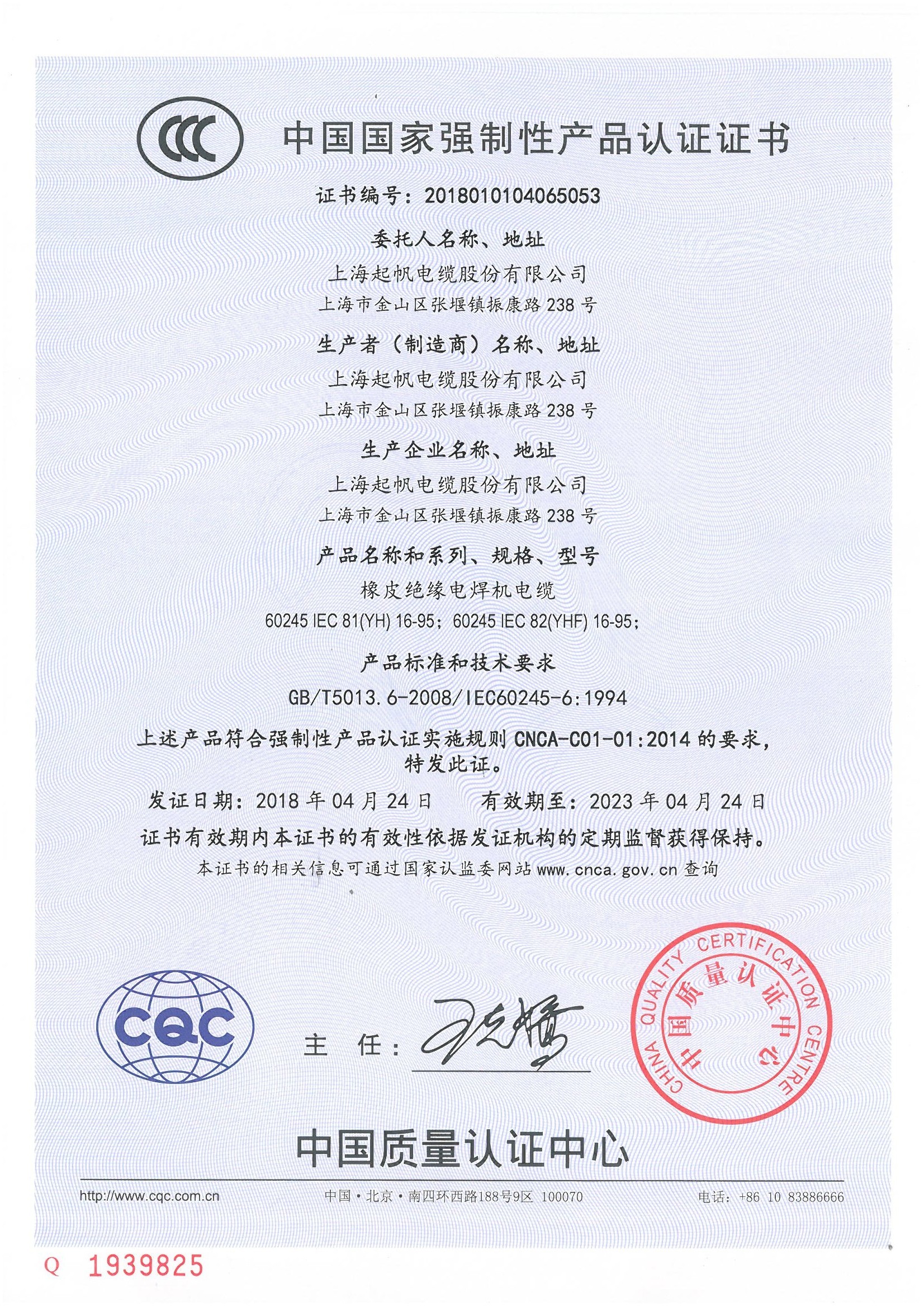 中國國家強制性產(chǎn)品認(rèn)證證書YH電焊機電纜