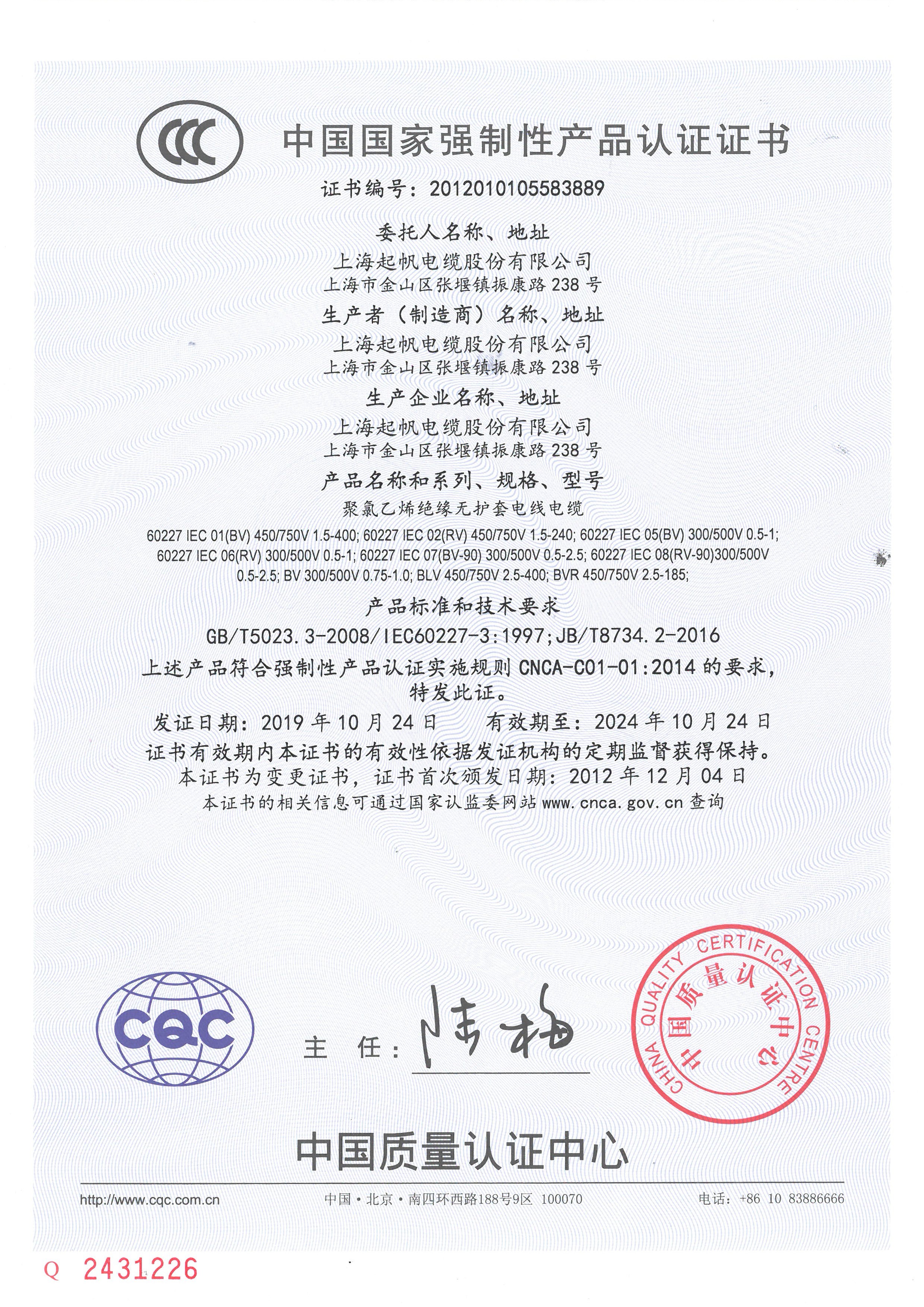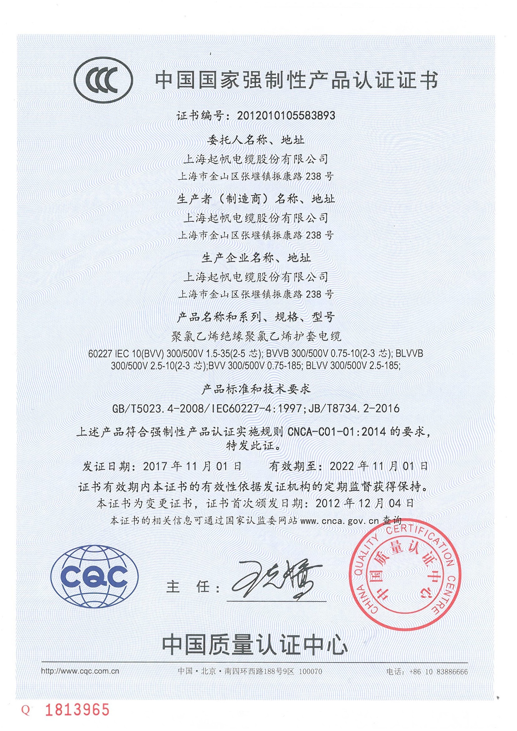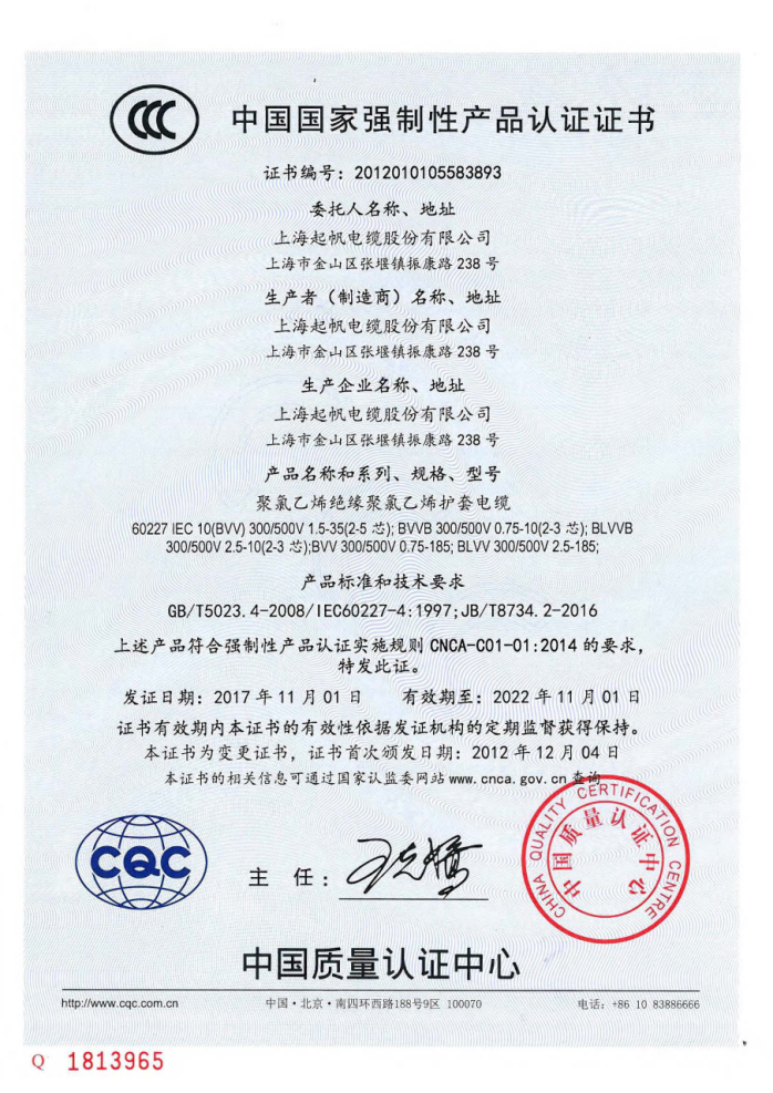 中國國家強制性產(chǎn)品認(rèn)證證書BV聚錄乙烯絕緣電線電纜