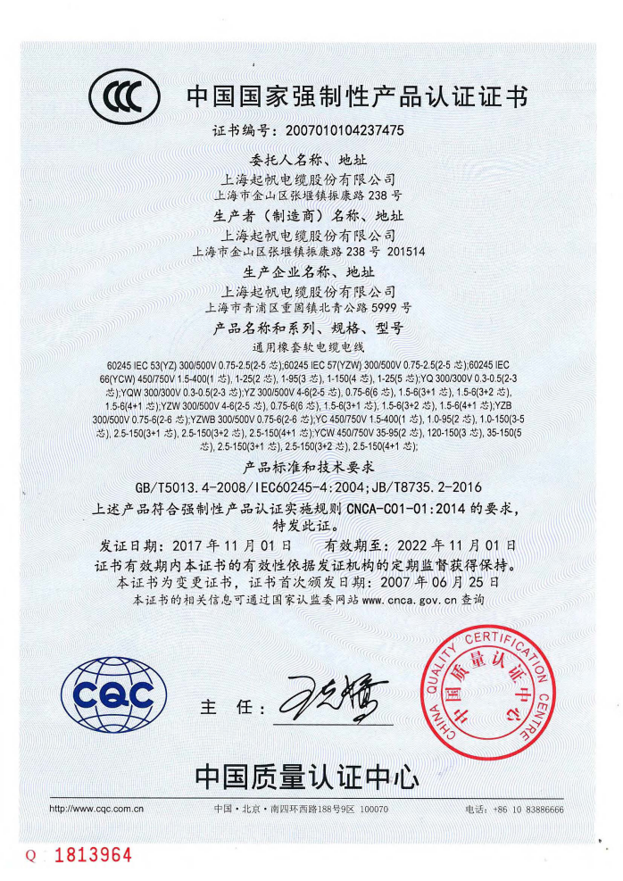 中國國家強制性產(chǎn)品認(rèn)證證書YZ橡套軟電線電纜