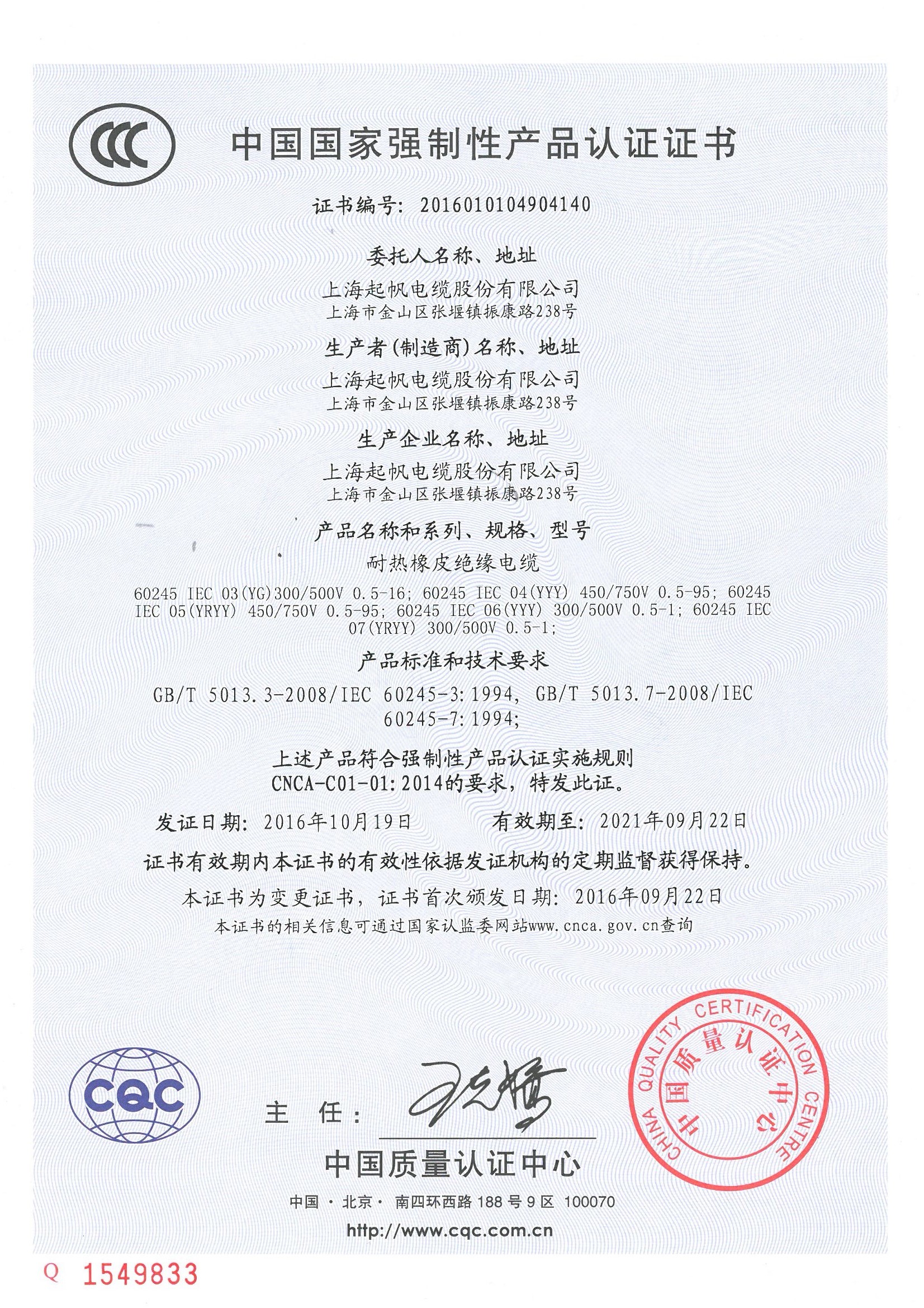 中國國家強制性產(chǎn)品認(rèn)證證書YG橡皮絕緣電纜